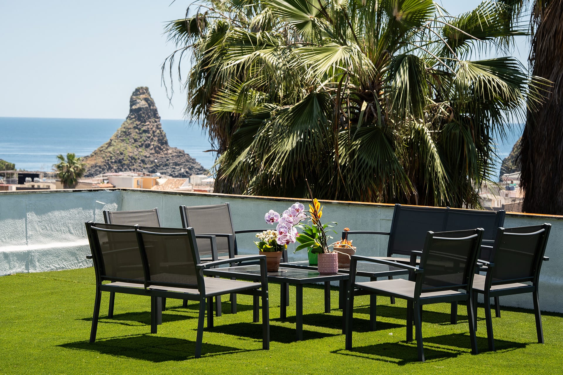 Inoltre, proponiamo un elegante appartamento con un terrazzo panoramico che offre una vista suggestiva sui faraglioni di Aci Trezza. Le nostre sistemazioni sono perfette per vivere un’esperienza indimenticabile nella splendida cornice siciliana.